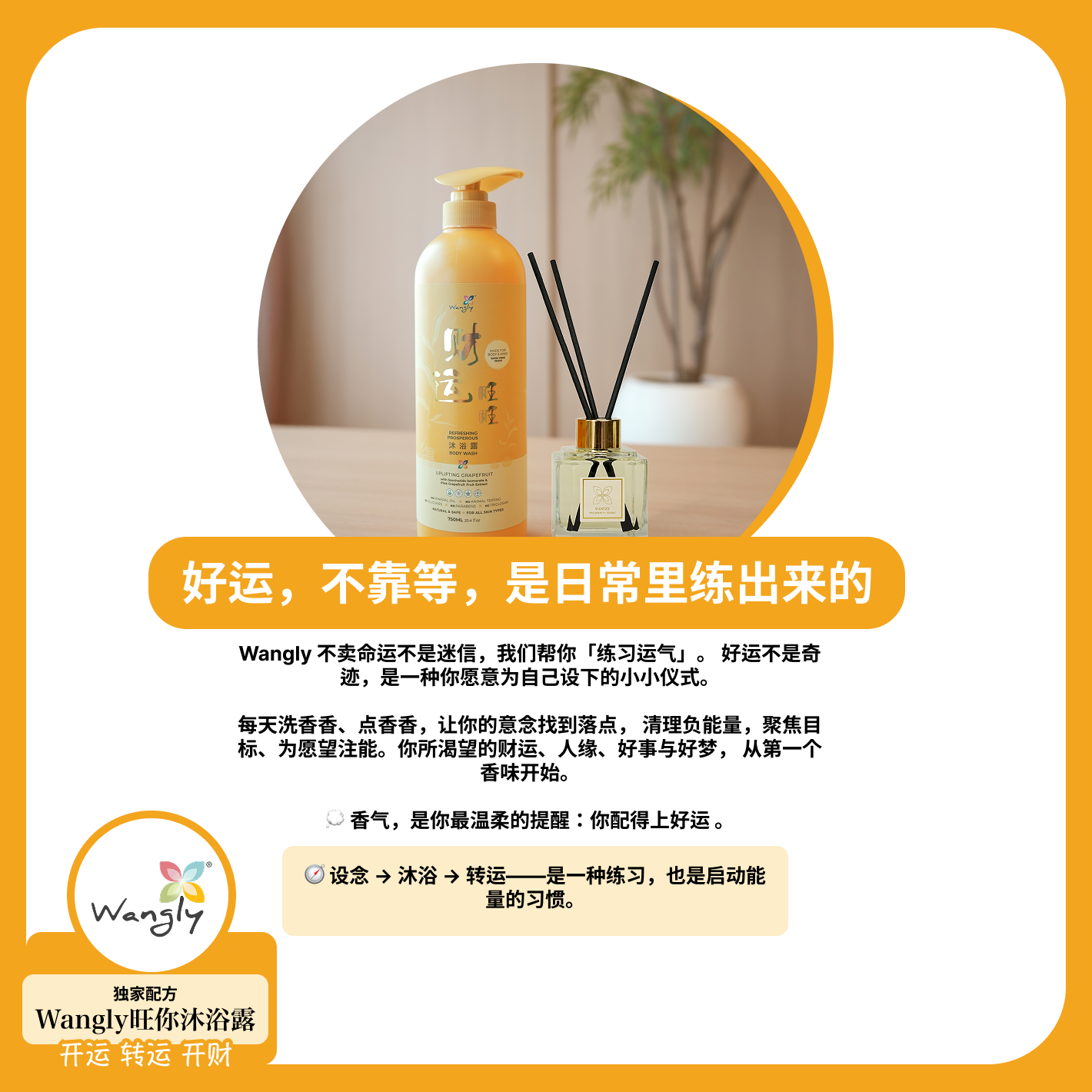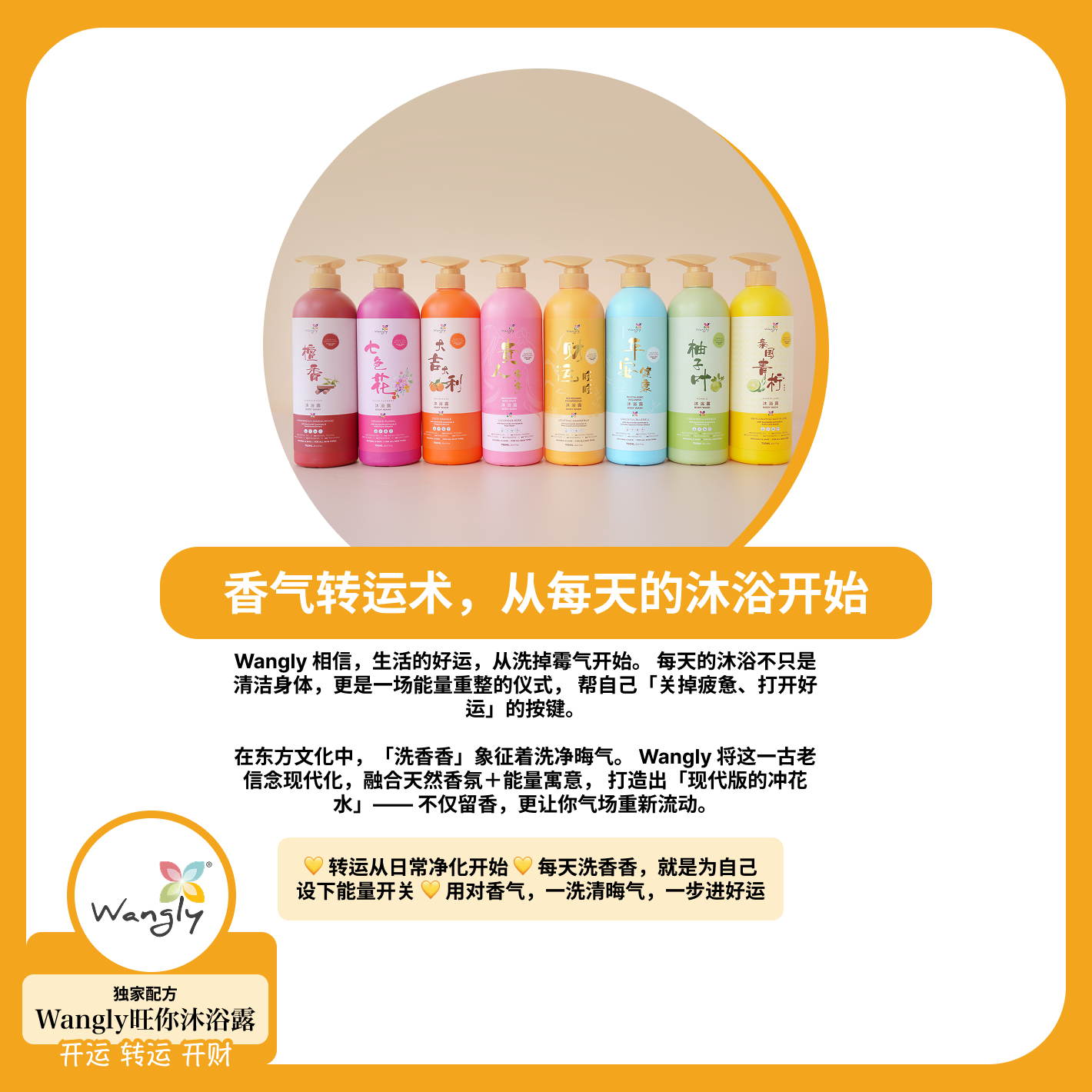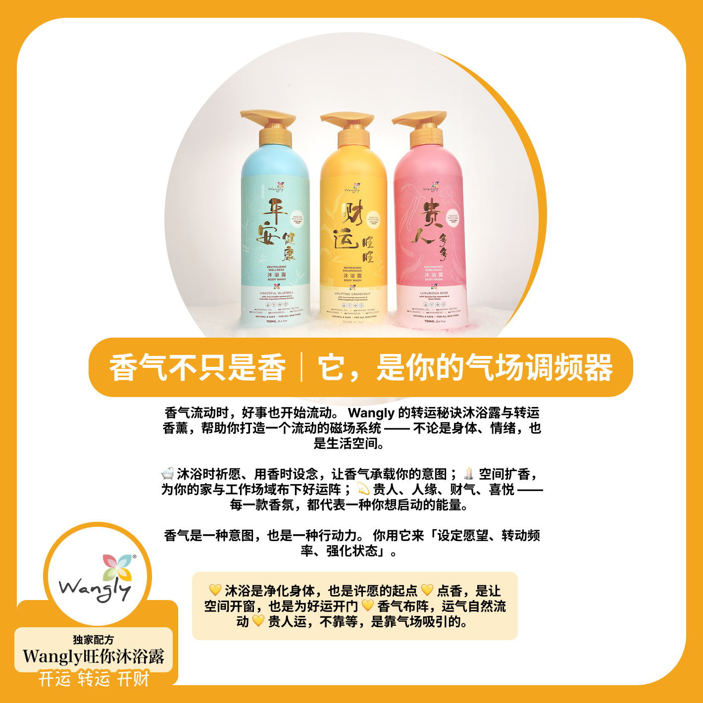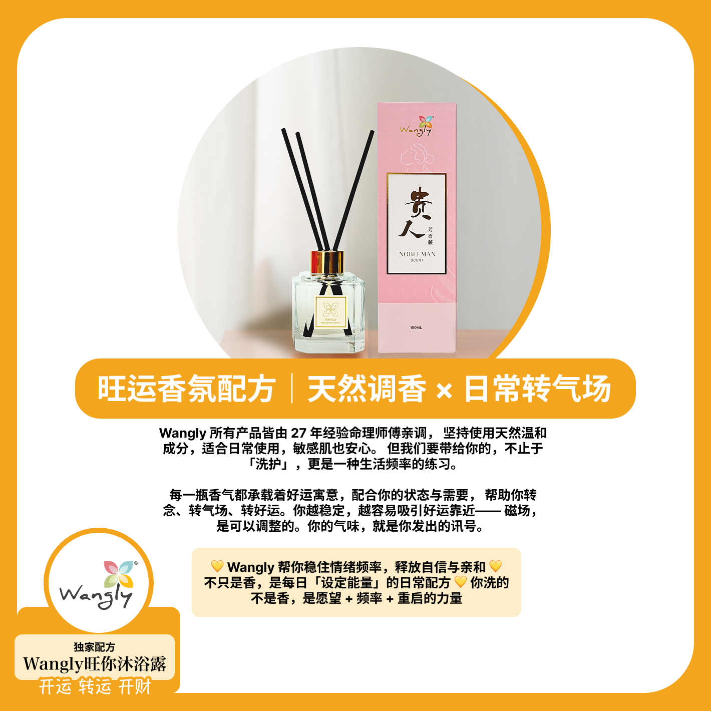 在 Wangly旺你,我们相信,养生不只是日常保养,更是一种仪式感。品牌融合东方传统与大自然精华,致力于打造能量调和的产品,帮助您焕发活力、提升情绪、迎来正能量。不论是清晨唤醒,还是夜晚舒压,我们的系列产品都能为您带来内在的平静与外在的焕新。 每一滴手工沐浴露与香氛,融合传统智慧与现代护养,为您带来身心灵的和谐平衡。
